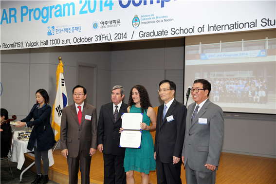 10月31日贝上午11点,在栗谷教学楼多媒体会议室举行了‘贝卡尔’项目结业仪式。‘贝卡尔’是阿根廷政府向海外派遣留学生,委托培养的一个项目。 去年,我校是韩国唯一一所被阿根廷政府‘贝卡尔’项目选中的学校,阿根廷政府公费派遣本国的人才去国外大学委托培养,其中我校共接收了30名研修生。在世界范围内,只有美国,法国,意大利,巴西等共5个国家开展了‘贝卡尔’项目。今年分配到我校的研修生比去年多出10名,共40名。除一人因个人原因取消外,39名研修生都已开始学习。研修生们在3个月400多个学时里完成了“韩国经济发展”、“创新经营方法论”、“韩国语”、“四个专业(IT(信息技术)、BT(生命工学技术)、NT(纳米技术)、ET(能源技术))”等方面的5种课程的学习任务。 校长安宰焕,阿根廷驻韩大使Jorg J.A. Roballo,韩国私学振兴财团理事长李元希等和结业生共同参加了结业仪式。 安宰焕校长说:“祝贺大家在亚洲大学顺利完成了研修课程,相信各位在研修期间学到的内容一定会对阿根廷的发展有很大帮助。” 阿根廷驻韩大使Jorg J.A. Roballo说:“在亚洲大学、韩国私学振兴财团和阿根廷驻韩大使馆的共同努力下,‘贝卡尔’项目得以成功开展。结业生们通过这次进修,掌握了很多技术发展、开发方面的专业知识,期待他们可以运用这些专业知识推动阿根廷的相关领域的发展。”