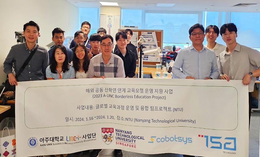 A project jointly executed by students of Ajou University and Singapore’s Nanyang Technological University for the development of a barista robot has been successfully completed.A presentation on the achievements of the barista robot project was held at Nanyang Technological University from January 16 to 20. The presentation brought together students from Ajou University and Nanyang Technological University who completed the joint project, which had been conducted online since September last year.The international industry-academia-research project was conceived by an Ajou University professor of mechanical engineering in Semester 2 last year who thought it would be a valuable learning experience for the participating students. Six Ajou University students and five mechanical and aerospace engineering students from Nanyang Technological University formed the project team in September of last year, with the objective of designing an AI robot that uses computer vision technology to make hand drip coffee. The six Ajou University students who participated in the project were Im So-yeon (digital media), Park Yong-joon (industrial engineering), Park Jun-ha (industrial engineering), Lee Dong-geon (industrial engineering), Kim Young-chan (integrative systems engineering), and Lee Chang-hoon (integrative systems engineering). Integrative Systems Engineering Professor Min Hyeun Jeong directed the students, who were provided with technical support from Cobosys, a robotic and automation solutions company. In the course of designing the barista robot, the Ajou University and Nanyang Technological University students held weekly online progress meetings on their research of hand drip coffee recipes used by expert baristas, their development of algorithms (water amounts, spiral drip control, etc.) for application of the recipes, and use of 3D cameras and deep learning for object recognition. The barista robot created through the project is able to locate the hand drip set used in coffee making through object recognition and the use of six-axis robot arms with grippers in executing sophisticated movements. The robot intelligently responds to any accident factors in operation to make coffee of a consistently high quality, which it then places in a serving area. A major achievement of the project is the use of computer vision technology in hand dripping automation, an example to be followed in future development of autonomous barista robots. Industrial engineering student Park Yong-joon, one of the participating Ajou University students, commented, “The project was memorable because it had me working with many others, attending meetings in English, and working with robot arms and AI vision technology, all of which were new experiences for me.” He added, “The lessons I learned though this five-month project will help me with choosing my career path.” Nanyang Technological University is an emerging university in Singapore, a tech education powerhouse that has been referred to as “the MIT of Asia,” having ranked 26th in the world in the 2024 QS World University Rankings and first in the 2023 THE Emerging Economies University Rankings.The project was made possible through the International Industry-Academia-Research Cooperation-based Education Model Development/Operation Support Project of the LINC 3.0 Project in execution by Ajou University. In the development of global talent, Ajou University jointly develops and uses learning materials and curricula with the faculty of foreign universities, gives students opportunity to gain experience at foreign universities and companies, and maintains an international network of industry-academia-research collaborators to plan and execute joint education projects. The development of effective global education models is a major focus of Ajou University. The students giving a presentation on project outcomesThe barista robot making hand drip coffee