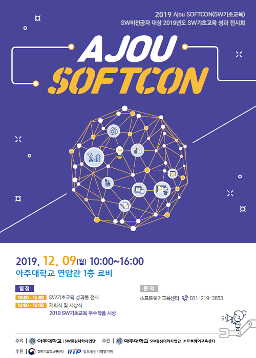 우리 학교 SW중심대학사업단이 학생들의 소프트웨어 개발 아이디어를 한자리에 모은 '아주 소프트콘'을 개최했다. SW중심대학사업단은 9일부터 이틀동안 아주대 연암관과 팔달관에서 '아주 소프트콘(SOFTCON)'을 열고 전시회를 마련했다. 소프트콘(SOFTCON)은 소프트웨어(SOFTware)와 콘서트(CONcert)의 합성어이다. Ajou SOFTCON은 매학기 진행되고 있는 소프트웨어학과의 행사로, 소프트웨어학과와 SW연계전공 학생들을 비롯해 주변 초등·고등학교 학생들이 한 학기 동안 창작해 낸 작품들을 전시한다. 이를 통해 학생들은 개발자로서의 노력과 열정을 함께 나누며 서로 격려하고 400여명이 발표자로 참여한다. 이번 전시회에는 ▲SW전공 6개 교과목 64건 ▲SW융합 5건 ▲초등 및 고등 방문형 SW교육 33건 ▲비전공자 SW기초교육 42건 등 총 144건의 작품이 전시되고, 심사 후 우수작품을 선정해 총 560만원의 장학금이 지급된다. 대회에는 인공지능과 사물인터넷, 빅데이터, 클라우드 등 최신 기술을 주제로 한 우수 작품들이 다량 출품됐다. 대표적으로 전시물의 경우, 통계청 'MDIS 서비스'를 활용해 기획재정부 장관 표창장을 받은 바 있다.류기열 SW중심대학사업단장은 "학생과 교수, 멘토, 관람자 모두가 한 학기 동안 힘써 개발해온 여러분의 작품을 놓고 서로 토론하고 교류하면서 모두 한층 성장하는 계기가 되기를 기원한다"고 말했다.□[개발시연] ▲대상(1팀:삼총사) ▲최우수상(1팀:JoJo) ▲우수상(2팀:shuffle, 팀1), ▲장려상(4팀:Wassup Noonssup, 공자, 뽀771, 행복IoT)□[연구과제] ▲최우수상(1인:김택림) ▲우수상(2인:신정호, LIJIPU) ▲장려상(4인:김성헌, 김정환, 김태훈, 이태경)□ [ICT융합] ▲우수상(1팀:사서고생하지마)□[SW기초교육] ▲대상(1인:김가현) ▲최우수상(3인:김성주, 김주훈, 조유현) ▲우수상(1팀 및 6인:간호대(정서현, 강유진, 강동혁, 김민아, 김채호, 김주연, 이수정, 윤여옥, 정선우), 강민재, 권율, 김지원, 류서윤, 조수연, 임인섭)□[방문형SW교육_초등부] ▲우수상(4팀:물에빠진쥐, 지니어스, “가변저항”이 필요햄!, 던전마스터)□[방문형SW교육_고등부] ▲최우수상(1팀:R1F4) ▲우수상(2팀:Chine法國, 아두이노동아리)▲장려상(3팀:윈도우19, 두.둥.탁, 호랑이손)