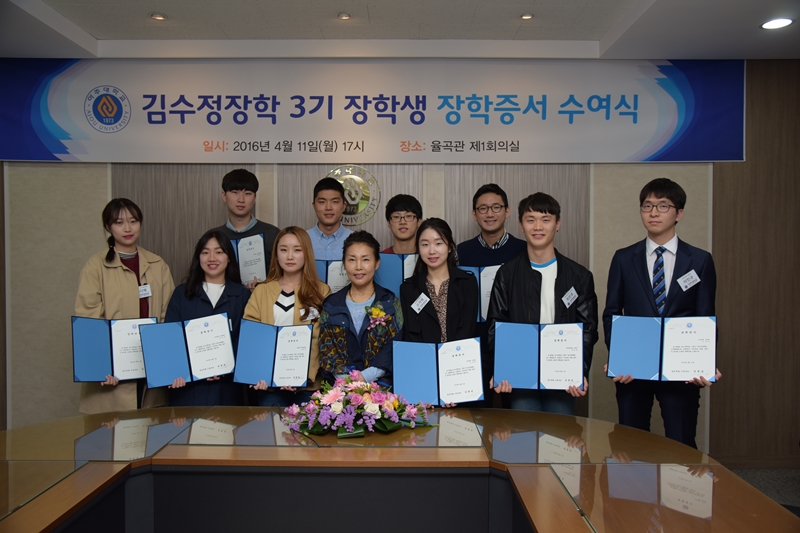 2016학년도 대우장학 수여식이 31일 오전 11시 율곡관 영상회의실에서 열렸다. 대우장학은 1993년부터 23년째 단과대학 학년별 수석에게 등록금 전액을 장학금으로 지급하고 있으며 올해에는 총 38명이 대상자로 선정됐다. 수여식에는 추호석 대우학원 이사장을 비롯해 대우장학재단 이사진, 각 대학 학장과 처장 및 관계자 그리고 장학생들이 참석했다. 행사는 조재형 학생처장의 대우장학 현황보고, 대우장학 영상 시청, 장학증서 전달, 장학생 대표 선서와 감사의 글 낭독 그리고 축사의 순으로 진행됐으며 대우장학재단 이사들의 격려인사도 이어졌다. 안치남(화학과,4) 학생은 “성실히 보낸 지난 학기의 성과가 전액 장학으로 돌아와 뿌듯하다. 졸업 후에 받은만큼 학교에 환원할 수 있도록 노력하겠다”고 장학생 대표로 감사의 뜻을 밝혔다. 추호석 이사장은 격려사에서 “성을 쌓으면 망하고 길을 놓으면 흥한다는 말처럼 장학생들이 단순한 금전적 지원에 만족하지 않고 원대한 꿈을 실현하는 계기가 되었으면 한다”고 말했다. 김동연 총장도 장학생들을 축하하며 “실력은 갖춘 대우장학생들이 매력도 함께 키웠으면 한다. 자신의 내면을 끄집어내 가치를 창출해낼 수 있는 사람이 되어주길 바란다”고 당부했다. ▲ 공과대학 송지훈(화학공학과,4), 박의균(기계공학과,2), 박소정(응용화학생명공학과,3), 최준원(화학공학과) ▲ 정보통신대학 신익재(전자공학과,1), 좌은지(미디어학과,2), 오동식(전자공학과,3), 안원혁(소프트웨어융합학과,4) ▲ 자연과학대학 이재협(수학과,1), 장현태(수학과,2), 심기전(수학과,3), 안치남(화학과,4) ▲ 경영대학 박종혁(e-비즈니스학과,1), 김나현(경영학과,2), 최상현(e-비즈니스학과,3), 박찬솔(4,경영학과) ▲ 인문대학 이룩한(영어영문학과,1), 강수민(문화콘텐츠학과,2), 유민정(불어불문학과,3), 임예은(영어영문학과,4) ▲ 사회과학대학 남민주(심리학과,1), 김가영(경제학과,2), 이지현(행정학과,3), 오병준(경제학과,4) ▲ 약학대학 윤태웅(약학과,1), 김소연(약학과,2), 김다혜(약학과,3), 김미정(약학과,4) ▲ 의과대학 서상현(의학과,1), 성지수(의학과,2), 이해인(의학과,3), 김민지(의학과,4), 허율강(의학과,5), 문성지(의학과,6) ▲ 간호대학 유희재(간호학과,1), 박찬양(간호학과,2), 김동연(간호학과,3), 유성희(간호학과,4)