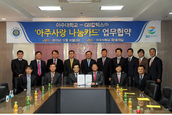 우리 학교가 GS칼텍스와의 아주사랑 나눔카드(할인 및 포인터 카드 적립) 협약식이 18일 오전 11시 30분 율곡관에서 열렸다. 협약식에는 안재환 총장, 유재석 대학원장, 박영동 교무처장, 조재형 학생처장, 한호 입학처장 등이 참석했고, GS칼텍스 측에서는 김광수 부사장, 정원현 전무, 민형준 상무 등이 참석했다. 아주사랑 나눔카드 사용자는 기존의 신용카드 할인에 추가 할인혜택을 받을 수 있으며 학교는 사용실적에 따라 GS칼텍스로부터 발전기금을 지원받게 된다. 대학발전본부는 아주사랑 나눔카드를 교직원, 동문, 관계자 및 일반인들에게 적극 홍보하여 2년후 3000명까지 회원을 늘릴 계획이다. 안재환 총장은 “오늘 GS칼텍스와 맺은 협약은 상호 윈윈하는 프로그램이다. 앞으로 양기관이 유기적인 협력관계를 구축해 상호이익을 증진할 수 있기를 기대한다.”고 말했다.