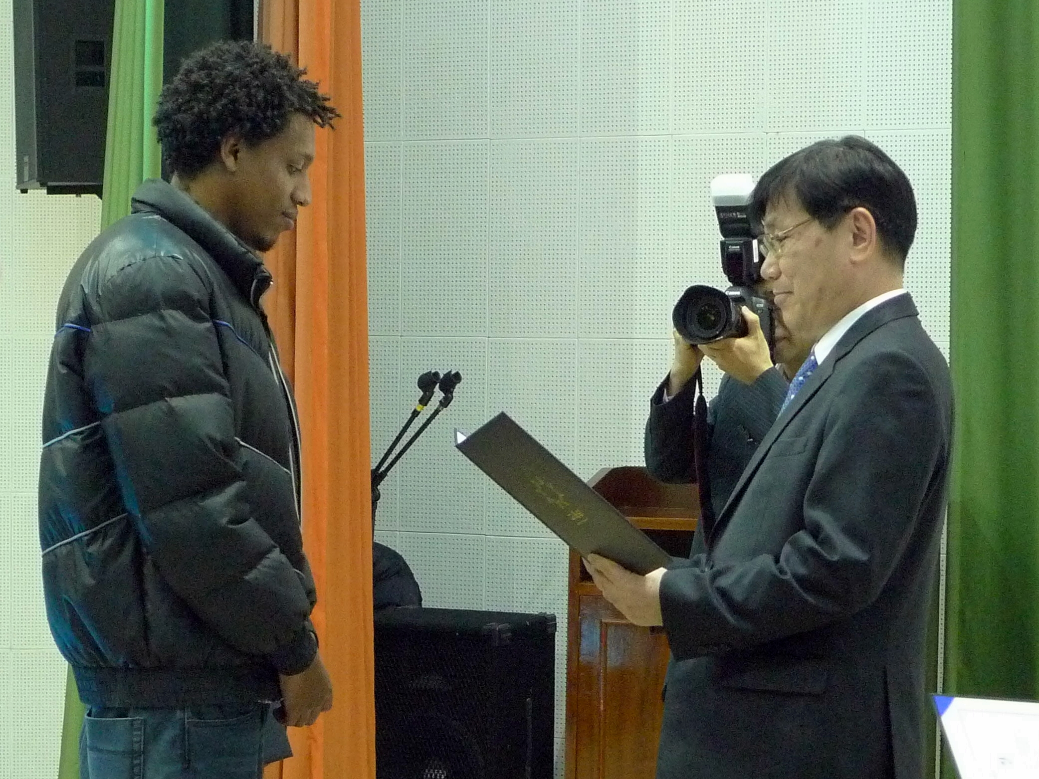 우리학교의 마티 버쿠마(Mati Bekuma) 학생이 2013년 정부초청외국인 장학생 중 학업성적우수 최우수자로 교육부장관상을 받았다. 시상식은 지난 20일 서울 국립국제교육원에서 열렸다. 국립국제교육원은 매년 외국인 대학원생 700여명과 학부생 100여명을 선발해 학비 및 생활비 전액을 지원해주는 ‘정부초청외국인 장학생’ 프로그램을 운영 중이다. 버쿠마 학생도 에티오피아 출신으로 이 프로그램을 통해 현재 우리학교 오상윤(정보컴퓨터공학과) 교수가 지도하는 컴퓨터공학과 석사과정에 재학 중이다. 학업우수상은 약 2500명의 정부초청외국인 장학생 중 학부, 석사, 박사 과정의 최종학년을 기준으로 성적평균평점(GPA)이 가장 높은 학생에게 수여하는 상이다. 과정별로 1명씩 총 3명에게 최우수상을 그리고 총 38명에게 우수상을 수여했다. 버쿠마 학생은 석사과정 대상자 중 학업성적이 가장 우수해 최우수상을 수상한 것이다. 버쿠마 학생은 “정부초청장학생으로 한국에서 공부할 수 있는 기회를 가질 수 있어 정말 감사하게 생각한다. 처음 한국생활 적응이 쉽지 않았는데, 지도교수와 친구들의 도움으로 극복하고 성공적으로 공부할 수 있었다.”며 “앞으로 졸업 후 한국과 에티오피아를 위해 도움이 되는 일을 할 수 있도록 노력하겠다.”고 수상 소감을 말했다.