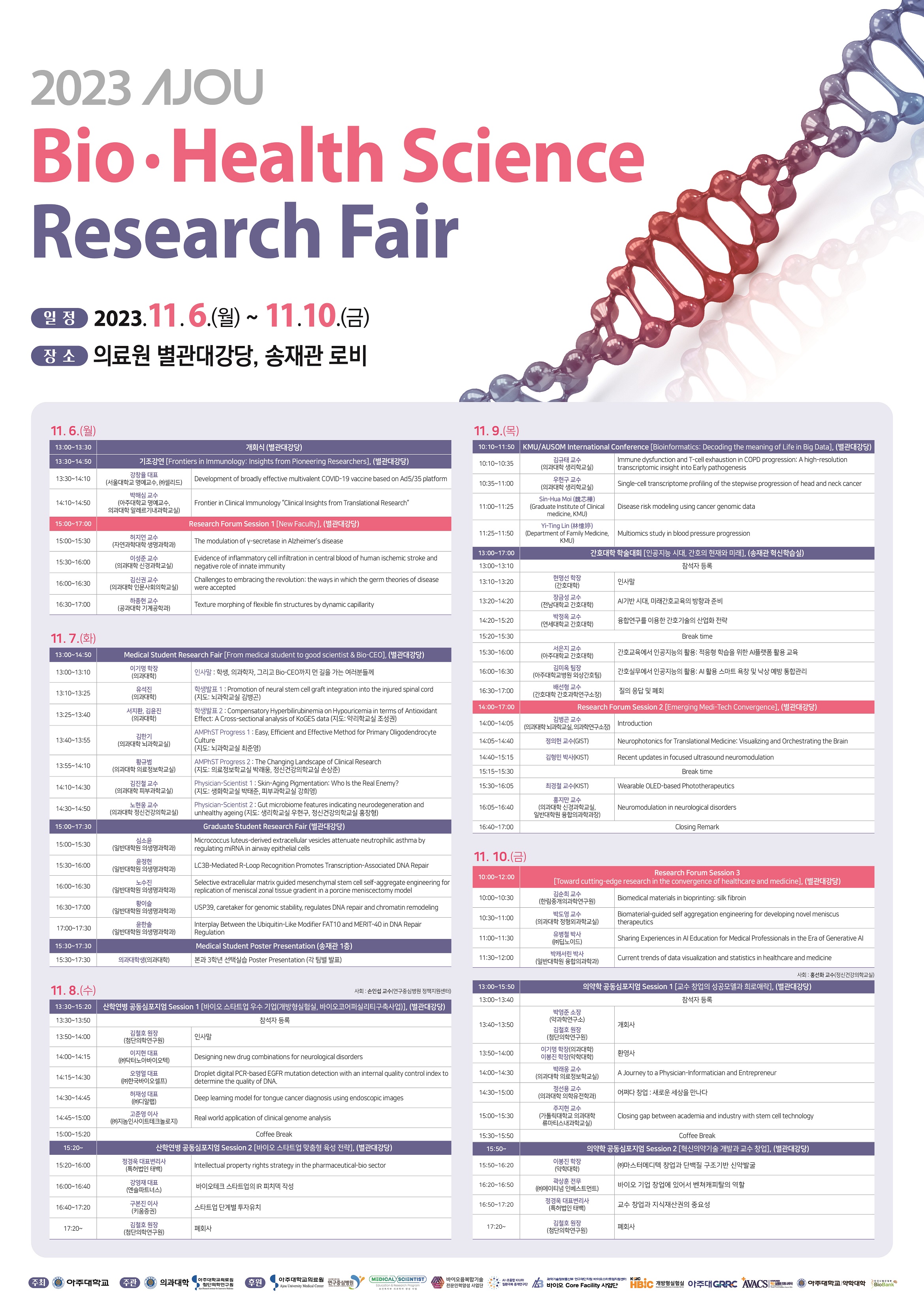 우리 학교가 '제1회 아주 바이오 세미나 ai'를 개최했다. 신경과학 및 줄기세포 분야의 세계적 석학을 초청해 최신 연구 동향과 성과를 공유하는 자리로 마련됐다.'제1회 아주 바이오 세미나(Ajou Bio Seminar.Ajou Innovations, ABS. ai)'는 지난 30일 오후 아주대 홍재관에서 진행됐다. 최기주 아주대 총장과 한상욱 아주대의료원장을 비롯한 대학 관계자들, 대학원생과 연구자들이 함께 자리했다. 미국 하버드대 의과대학의 김광수 교수와 아주대 의과대학 박상면 교수가 파킨슨병의 치료법에 대한 최신 연구 결과와 견해를 발표했다. 현재 미국 하버드 의과대학의 맥린(McLean)병원 분자신경생물학실험실 소장을 맡고 있는 김광수 교수는 지난 30년 연구해온 생명과학 분야의 전문성을 바탕으로 파킨슨병의 새로운 치료법 개발에 집중해왔다. 이날 세미나에서도 파킨슨병 환자의 피부세포를 역분화시켜 유도만능줄기세포(iPSC)로 만든 뒤 다시 도파민 신경세포로 분화해 뇌에 이식, 세계 최초로 파킨슨병 치료에 성공한 사례에 대해 발표했다. 그는 또 새로운 신경보호제 개발과 파킨슨병 맞춤형 자가세포치료를 위한 효율적인 플랫폼 구축을 위해 노력하고 있다고 밝혔다. 우리 학교 의과대학 뇌질환융합연구센터 센터장을 맡고 있는 박상면 교수(의과대학 약리학교실) 역시 파킨슨병의 발현에 대한 연구 결과를 발표하고, 치료제 개발에 대한 견해를 전했다. 이번 행사는 의료 및 바이오 분야의 최신 연구 동향과 결과를 공유하고, 의과대학을 비롯한 아주대 소속의 여러 연구진이 긴밀한 교류를 통해 융합연구를 펼쳐갈 수 있도록 돕고자 마련됐다. 아주브레인추진사업단, 아주대학교 의료원 첨단의학연구원, 아주대학교병원 개방형실험실, 켐바이오메디신 교육연구단, AI-초융합 KIURI 질환극복 중개연구단, 첨단미래소재디스커버리사업단이 공동 개최했다. 미국 하버드대 의과대학의 김광수 교수의 발표아주대 박상면 교수(의과대학 약리학교실)의 발표 후 질의 응답