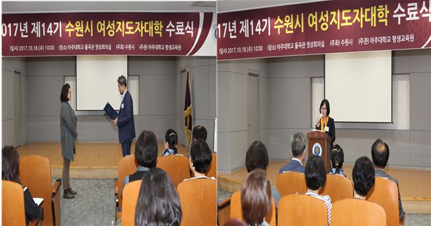 [평생교육원, 수원시] 제14기 수원시여성지도자대학 수료식 개최 10월 18일, 제14기 수원시여성지도자대학 20주간의 여정을 끝내고 수료를 맞이했다. 수원시여성지도자대학은 14년간 지속적으로 주관하고 있으며 수원시 거주하는 여성을 대상으로 21세기 리더로 활동할 수 있도록 다양하고 특화된 교육을 통해 정치, 사회 참여동기를 부여하며 여성리더로서의 리더십을 키워갈수 있도록 운영하였다. 제14기 수원시여성지도자대학은 총 17개 강좌로 진행된 본 과정은 평생학습의 필요성을 느끼게 했던 교육대학원 최운실 교수의 첫강의를 시작으로 인문대 박만규, 교육대학원 김주후, 의과대학 박샛별, 심리학과 김완석 교수 등 본교 교수진의 내실있는 강의와 소설가 강진, 경기도 선거관리위원회 주선미 교수, 출판전문가 송숙희 강사 등 외부 전문가들의 특강으로 진행되었다.이번수료식은 이성엽 평생교육원장의 기념사, 엄태영 수원시장의 영상축사로 시작되었고, 이어 수원시 여성리더회 김미선 총회장 격려사가 진행되었으며 수원시 여성정책 장동훈과장, 박세준팀장, 김진옥 주무관을 비롯하여 수원시 여성리더회 10명의 차기회장들과 임원들이 자리를 참석하여 빛내 주었다.총 59명 원우 중 85%이상인 50명이 수료하였으며 개근상은 김윤정 외 9명이 수상하였고 또한 부단히 14기 교육생들은 이끌어준 김춘녀 회장이 공로상을 수상하였다. 교육 과정 중 각각의 주제를 정하여 팀를 편성한 후 팀별 활동을 진행하였고 그 결과를 수료식에서 발표하여 시상을 진행 하였다. 대상은 자기개발조 황은숙 원우 외 9명 그리고 최우수상 지역문화조 장일연 외 9명, 우수상은 여성정책조 박덕례외 7명이 수상하였다.제14기 수원시여성지도자대학을 수료한 원우들은 함께한 배움이 즐거워지고 그 시간이 가장 행복한 시간 이였기에 감히 감사의 말을 전한다고 소감을 밝혔다. 제15기 수원시여성지도자대학은 18년 5월에 개강할 예정이며 자세한 사항은 아주대학교 평생교육원(031-219-3583)으로 문의하면 된다.