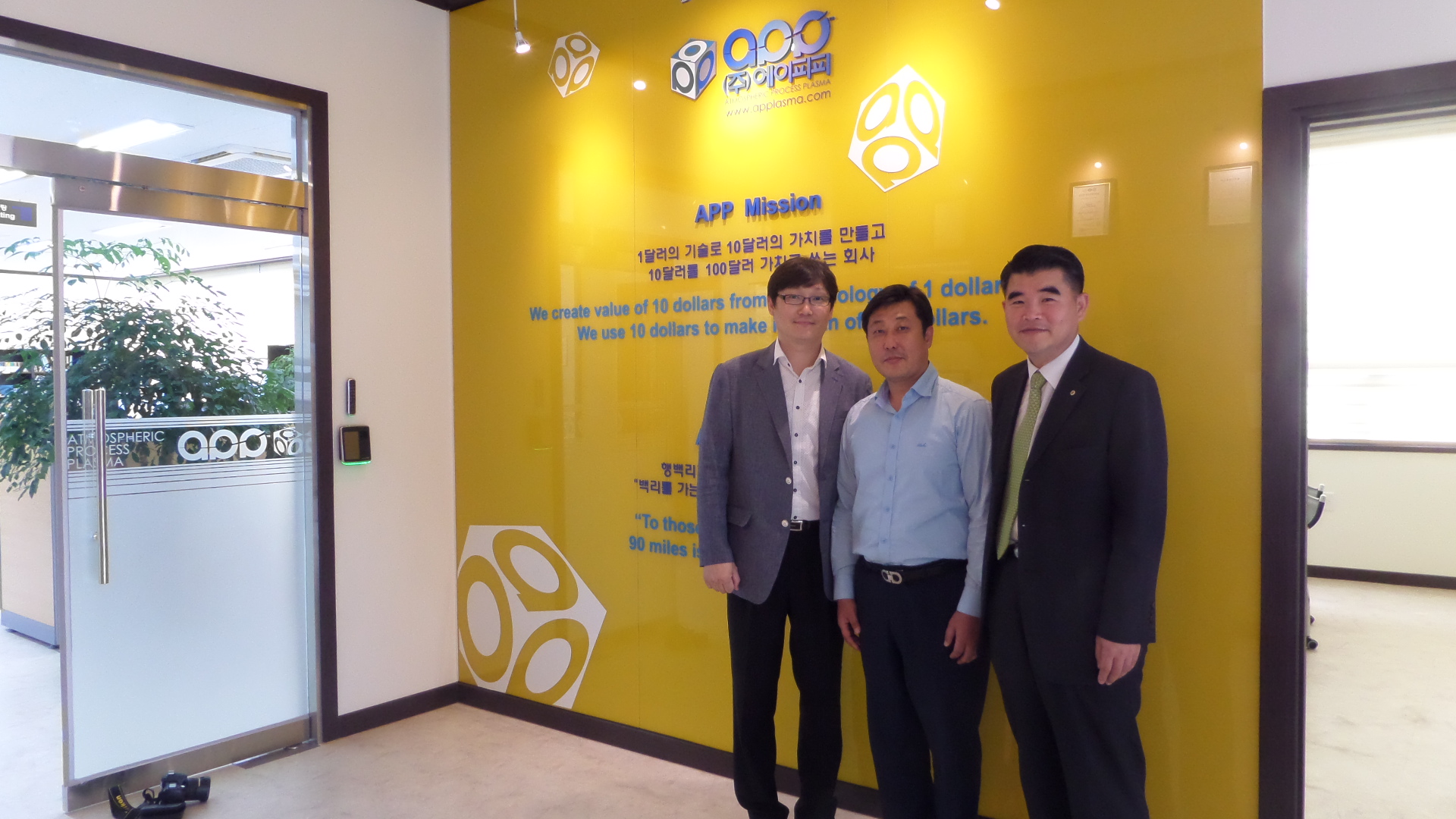 방문대상자 성 함 : 강방* 대표이사(화공90‘) 소 속 : ㈜에이피피 방문자 성명 : 이강준, 황원복(대학발전팀) 방문일시 : 2015년 9월 18일 14시 30분 방문장소 : ㈜에이피피 본사 – 경기도 화성시 동탄면 동탄산단2길 7-12 (동탄면 방교리 846-3) ㈜에이피피는 진공플라즈마의 고품질을 대기압에서 실현한 대기압 플라즈마 발생기술 및 장치를 특허로 보유한 플라즈마 전문회사로 2006년 2월에 설립되었다. 창업과 함께 안전하면서도 간편하게 사용할 수 있는 세계최대 면적의 핸드플라즈마 장비인 [마이플100]과 [마이플200]의 개발을 시작으로 연이어 산업용 플라즈마 장비 및 모듈형, 에칭용 등 다양한 플라즈마 장비를 개발하였다. 기능적으로 소재의 개질 및 세정 등 표면 처리를 기본으로 하여 에싱, 에칭, 화원, 살균, 초소수성 박막 등 기능성 솔루션을 위한 다양한 형태의 표면처리 장비를 개발, 공급하고 있다. 모교 창업보육센타에서 3년간 연구개발에 집중하여 회사의 기술적 토대를 마련하였고, 2010년 삼성테크노파크를 거쳐 2014년 1월 동탄산업단지로 본사를 이전하였다. 현재 총 20명의 직원으로 매출의 70% 이상이 해외 거래에서 발생하고 있다. 2014년 무역의 날에 “백만불 수출의 탑”을 수상하였고 2015년 8월 현재 60억원 정도의 매출을 보이고 있다. 강방* 대표는 화학공학과 90학번으로 2002년에 대학원 분자과학기술학과를 졸업하였고 자체 개발의 특허기술로 승부하기 위한 창업을 결심하였다. 지난 2013년도부터 시작한 모교 경영대학원의 경영관리MBA를 거치면서 ‘작은 중소기업도 글로벌 경쟁을 해야 한다!’는 현실 자각과 함께 100년 기업을 위한 ‘기업문화’에 관심을 가지게 되었다. ‘경쟁력 있는 기업’과 ‘강한 기업문화’, ‘인재확보’라는 화두를 직원 전체가 공유하기위해 노력하고 있으며, 2015년 1월부터 기업문화 정착을 위해 컨설팅을 진행하고 있다. 강 대표는 사람의 성장이 기업의 지속성장을 유지하는 비결이라고 말하며, 이를 위해 모두에게 몰두하여야 한다고 말했다. 특히, 이익과 가치가 상충될 때는 1%의 역설을 가능하게 하는 힘의 원천으로 무엇보다 ‘진실’하여야 한다고 평소 경영관을 피력하였다.