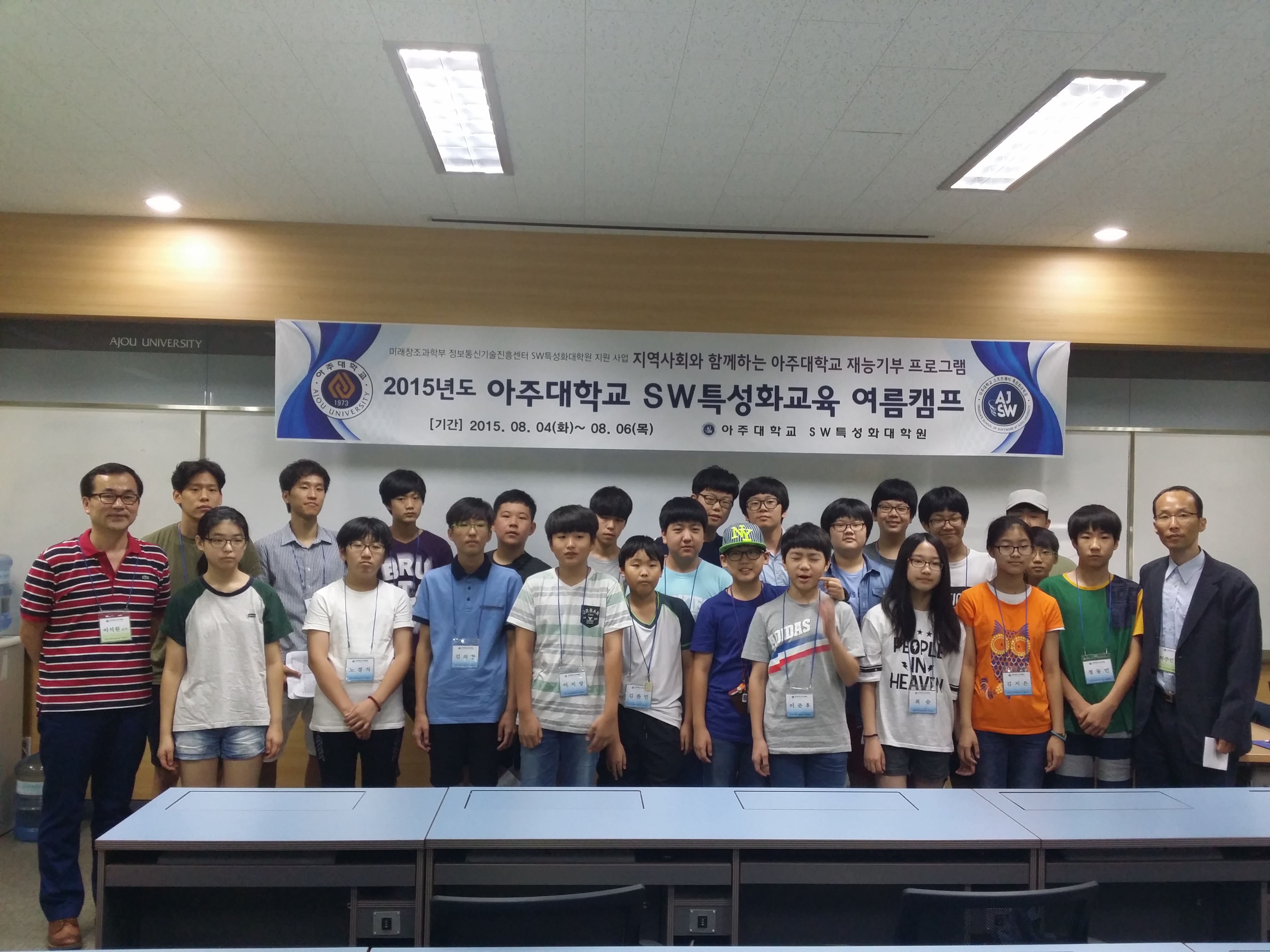 아주대학교 대학원 소프트웨어특성화학과에서는 2015년 8월 4일(화) ~ 8월6일(목) 3일 동안 초중등 학생을 대상으로 [SW특성화교육 여름캠프]를 개최했다. 올해 처음으로 개최된 [SW특성화교육 여름캠프]는 지역사회와 함께하는 아주대학교의 재능기부 프로그램으로서, 수원시에 위치한 초중등학생을 모집하여, 스크래치를 활용한 SW개발, 게임엔진을 활용한 모바일게임SW 개발 등 재미있는 내용으로 초중등 학생들에게 소프트웨어에 대한 유익한 경험을 함께한 자리였다. 2015년 [SW특성화교육 여름캠프]는 초등학생과 중학생 각각 저마다의 생각과 배운 것을 토대로 작품을 만들고 이를 발표하는 자리를 가지면서 학생들 각자가 갖고 있는 가능성을 확인할 수 있는 시간이었다. 또한, 교육에 참여한 학생들은 스스로의 생각을 컴퓨터를 통해 구현해 보는 과정에서 재미를 느끼고 많은 열의를 보였다. 이번 [SW특성화교육 여름캠프]를 통하여 더 많은 인재들이 소프트웨어를 만들고 활용하는 일에 참여할 수 있도록 동기를 부여한 유익한 시간이 되었을 것이다. 대학원 소프트웨어특성화학과는 미래창조과학부의 '2012년도 소프트웨어특성화대학원 지원사업'(총괄책임교수 이석원)에 선정된 국내 1호 소프트웨어 특성화대학원이다. 미래부로부터 총 80억 원의 연구비를 지원 받아 학생 전원에게 2년 간의 대학원 등록금과 세계 최고 소프트웨어 교육 기관인 美 CMU/SEI에서의 현지 교육 기회를 제공한다.