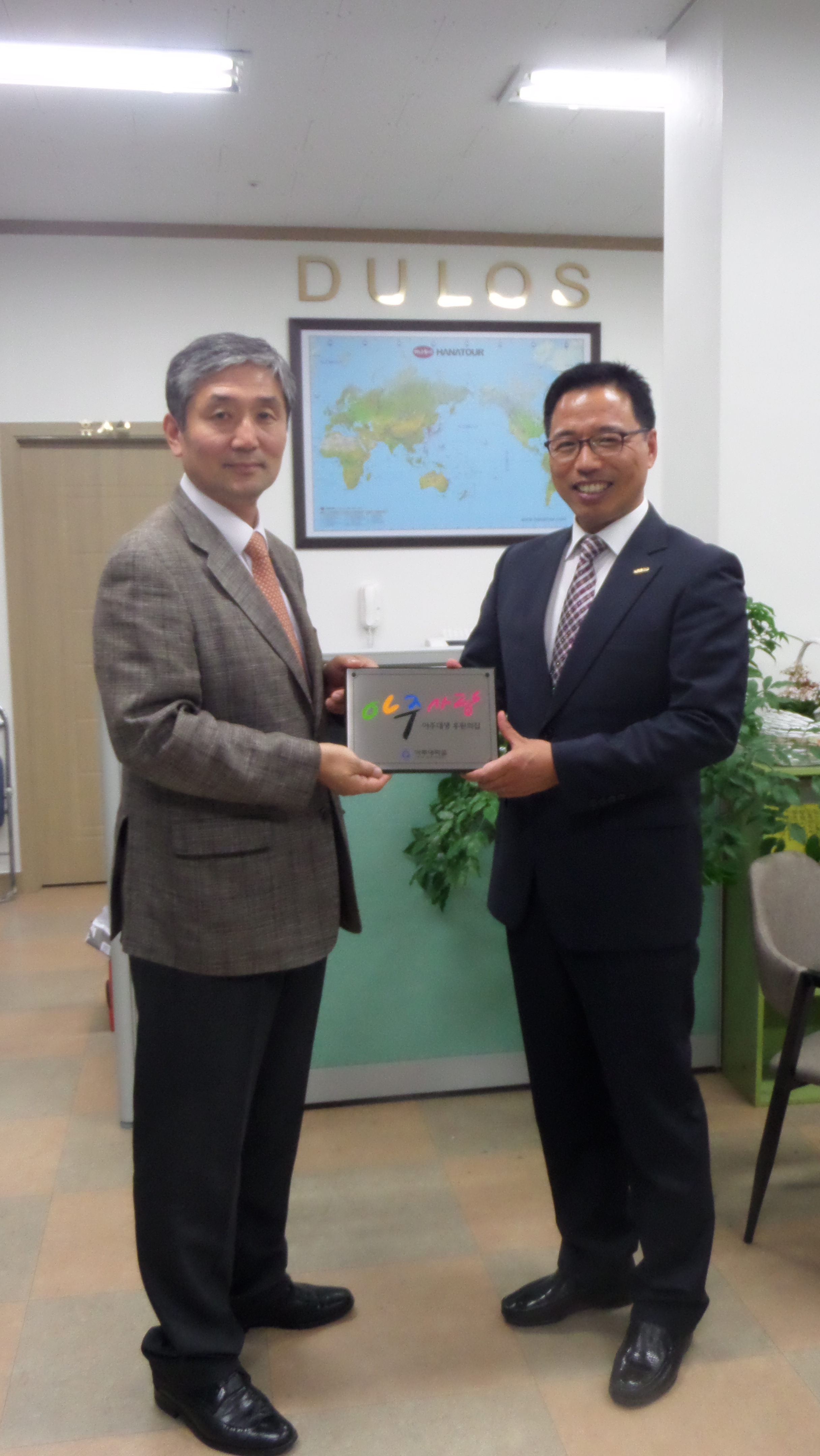 사진설명 : (왼쪽부터)김윤기 대학발전본부장, 우재* 대표 지난 5월 12일 대학발전본부에서는 「아주대생 후원의 집」캠페인에 참여한 '(주)둘로스여행사'를 방문하고 현판식을 진행하였다. '둘로스여행사'의 우재* 대표는 저소득층 자녀와 독거노인 지원사업을 수년전 부터 해온 기업가이고, 해외자매도시 평화의 소녀상 건립에도 기여한 사회공헌기업이다. 서울과 수원에 사무소를 두고 있으며, '고객의 만족을 넘어 섬김을 지향하는 여행그룹으로이 성장이 목표'라는 말로 회사소개를 대신하였다. 홈페이지 : http://www.dulostour.com/ Address: 서울사무소 서울시 마포구 마포대로 127 풍림 vip텔 923호 T : 02 6674 6684 F : 02-6674-6685 E:krpm12@tourpick.co.kr 수원사무소 경기도 수원시 오목천로 46(한양빌딩 401호) T : 1600-6684 F : (031)358-9111 E: yhlee@dulostour.com