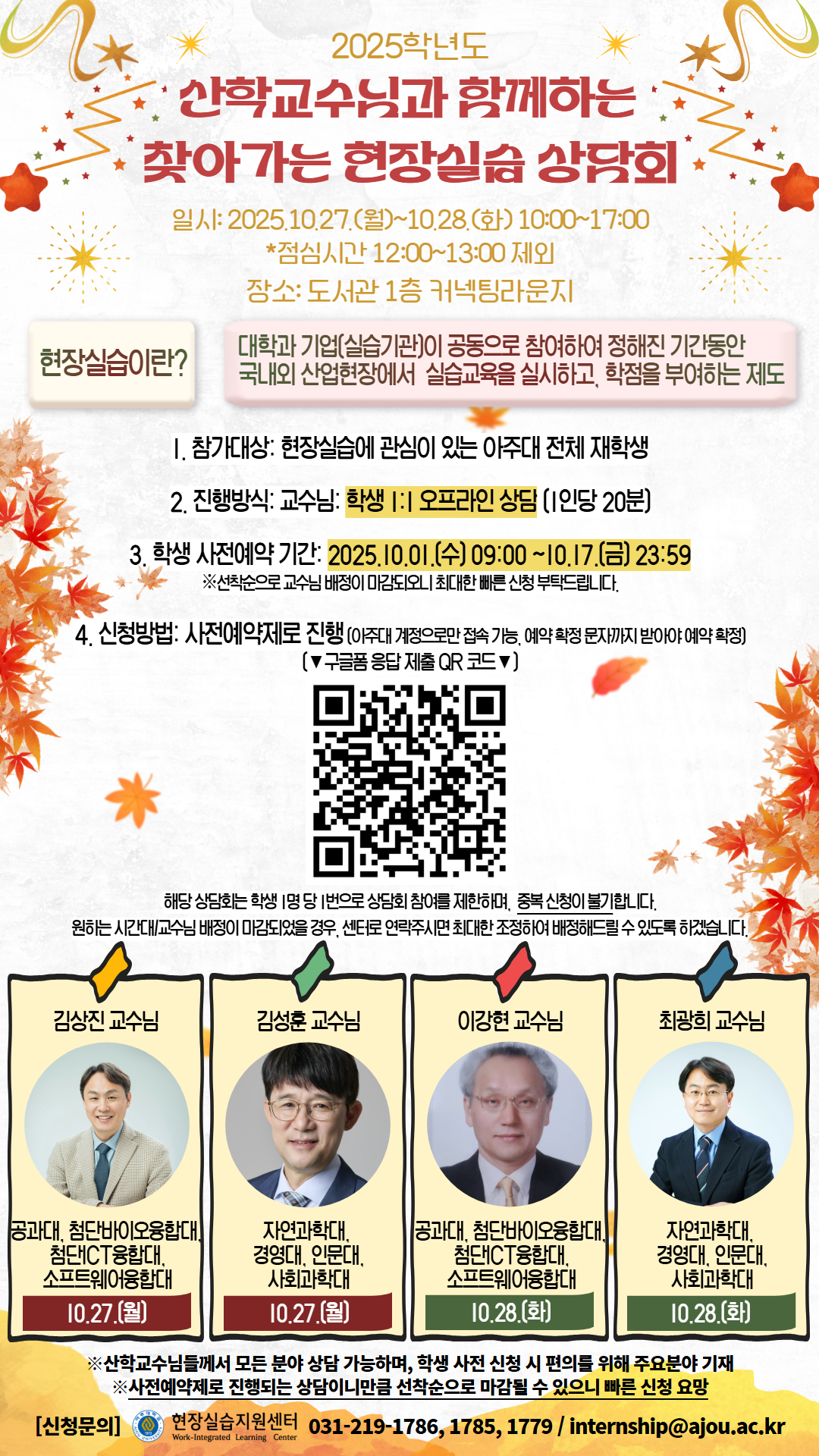 [재공지] [RISE] 🍁2025 산학교수님과 함께하는 "찾아가는 현장실습 상담회" 사전예약 안내 (★~10.17.(금)까지 ) 🍂