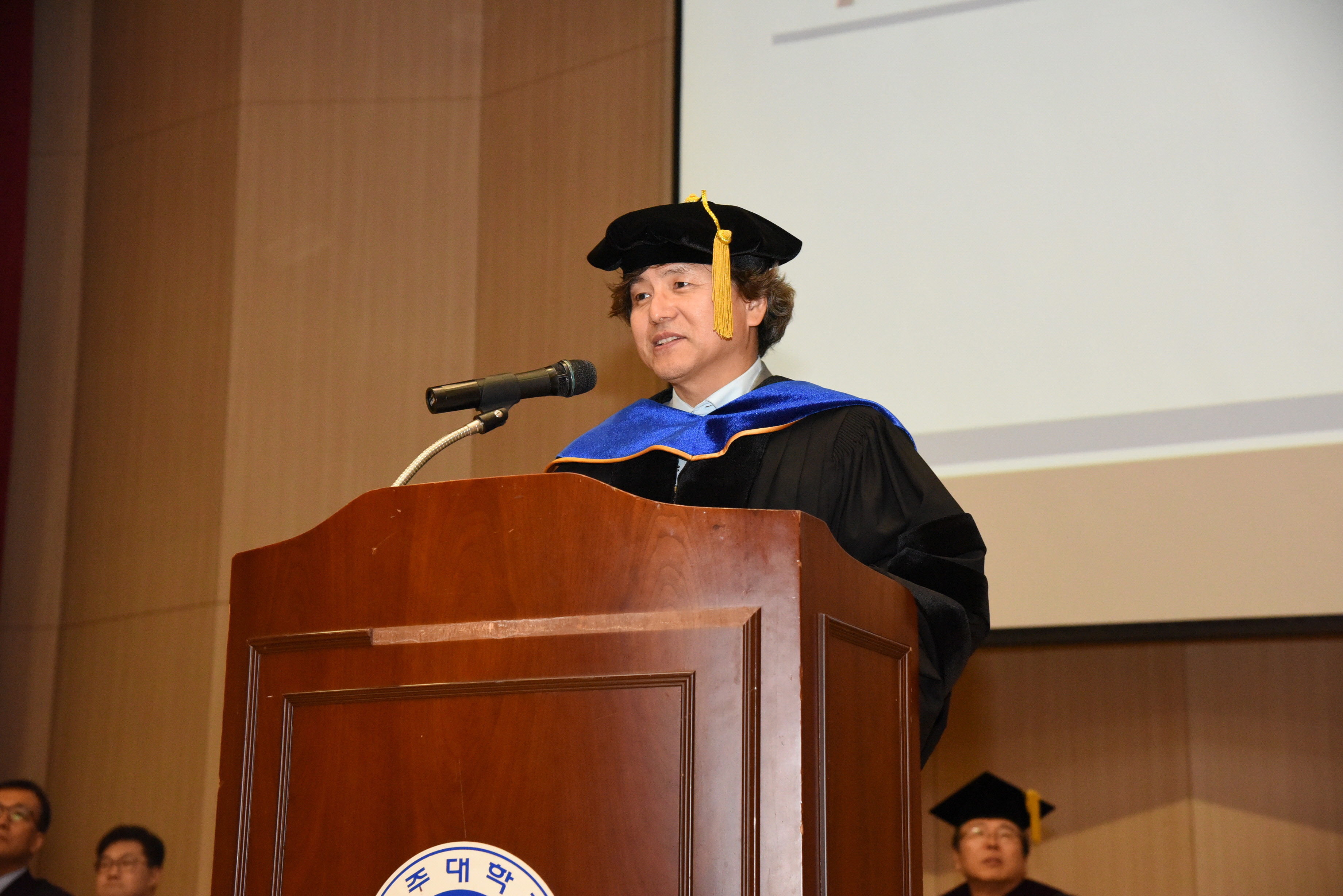 제8회 법학전문대학원 학위수여식이 지난 12일 오후 2시 종합관 대강당에서 열렸다. 학위수여식에는 박형주 총장과 구재군 법학전문대학원장을 비롯해 윤준 수원지방법원장, 차경환 수원지방검청청 검사장, 이정호 경기중앙지방변호사회 회장, 졸업생 가족 및 재학생 등이 참석한 가운데 43명의 졸업생들에게 학위가 주어졌다. 학위수여식은 1부에서 ▲학사보고 ▲학위수여식사 ▲축사 및 격려사▲학생대표 학위수여 ▲시상식 등을 시작으로 2, 3부에서 ▲전원 학위수여 ▲송사 및 답사 ▲기념촬영 등으로 나뉘어 진행됐다. 시상식에서는 ▲총장상 박새벽 ▲수원지방법원장상 현준우 ▲수원지방검찰청검사장상 전정우 ▲경기중앙지방변호사회장상 한윤미 ▲원장상에 권대근 ▲공로상에 권대근, 김민수 등이 각각 수상했다. 박형주 총장은 학위수여식사를 통해 "지난 한 해 우리 법학전문대학원은 아주대학교의 자랑이었고, 법무부의 변호사시험 합격률 누적 전국 4위라는 우수한 성적이 발표됐다"며 "‘함께’ 좋은 결과를 만들어가자는 분위기, 어렵고 긴 공부일수록 ‘함께’ 해나가야 한다는 서로간의 격려, 교수진과 교직원 그리고 학생들이 한 방향을 바라보고 ‘함께’ 나아가고자 하는 협력의 지성이 우리의 힘이었다"고 말했다. 이어 박 총장은 "동료와 선후배들이 서로 사례를 공유하고 연구하며, 아주대학교 법학전문대학원이라는 이름으로 '함께' 앞으로 나아가기를 바란다"고 졸업생들에게 당부했다. 구재군 법학대학원장은 "우리 학교 법학전문대학원은 경기도 유일의 법학전문대학원으로서 2009년 개원한 이래 많은 분들과 지역사회의 도움으로 성장했다"며 "법조인으로서 사회에 첫발을 내딛는 학생들을 격려하고 아낌없이 축하한다"고 밝혔다.