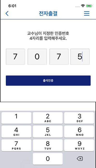 교수님이 지정한 인증번호를 입력한 경우, 출석으로 처리됩니다.