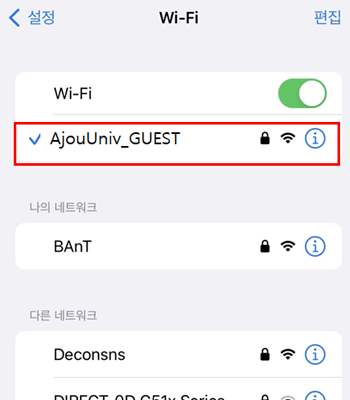 4. Wi-Fi SSID 목록 중 “AjouUniv_GUEST” 클릭