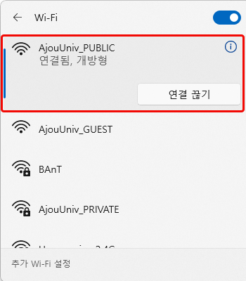 6. “AjouUniv_PRIVATE”에 연결됨을 확인한 후