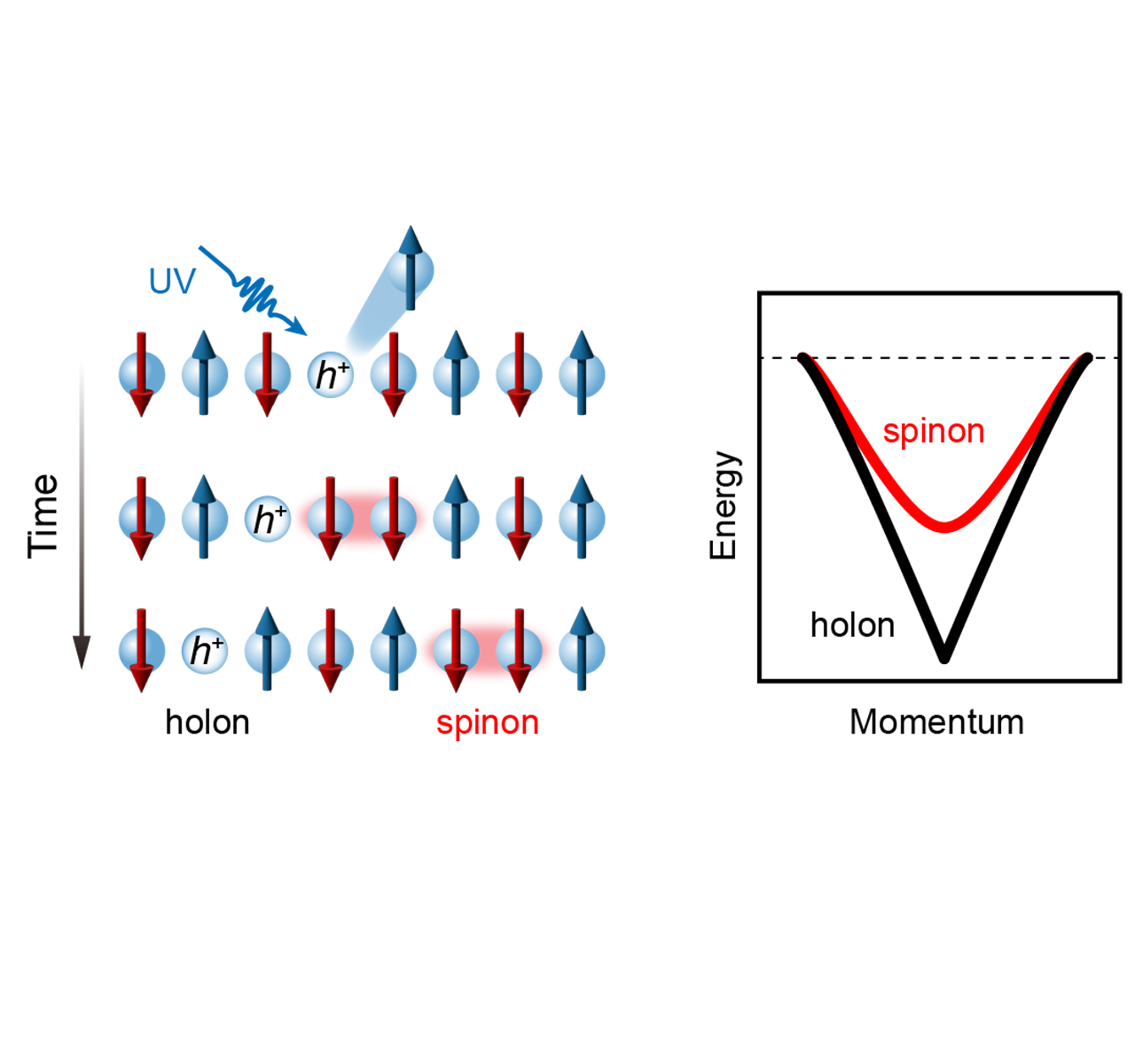 아주대 연구진이 그동안 이론적으로는 예측되어왔으나 실제 직접 관찰은 어려웠던 금속 물질에서의 스핀-전하 분리를 처음으로 직접 관찰하는 데 성공했다. 이에 향후 후속 연구를 통해 초전도 현상 규명의 실마리를 얻고, 새로운 양자 정보 소재로도 활용될 수 있을 전망이다. 물리학과 김성헌 교수와 한국과학기술원(KAIST) 현정훈 박사·김용관 교수 공동 연구팀은 1차원 사슬구조 물질 내에서 도체-부도체 전이에 걸쳐 스핀-전하 분리 현상을 관측하는 데 성공했다고 밝혔다. 이번 연구 내용은 ‘준1차원 NbSe3의 전하밀도파 전이에 걸친 밴드 선택적 스핀-전하 분리(Band-selective spin-charge separation across the charge density wave transition in quasi-1D NbSe3)’라는 제목의 논문으로, 미국물리학회가 발간하는 물리학 분야의 저명 학술지 <피지컬 리뷰 레터스(Physical Review Letters)> 최근호에 편집자 추천 논문(Editors’ Suggestion)으로 게재됐다.전자(Electron, 電子)는 물질의 원자를 구성하며, 음전하를 띄는 기본 입자다. 전자는 전하(charge)와 스핀(spin)이라는 두 대표적 성질을 보인다. 전하는 전기적인 힘을 느낄 수 있게 하는 기본 성질로, 전기가 흐르게 하는 요소다. 스핀은 전자가 스스로 회전하는 것과 같은 양자역학적 성질로, 자석과 같은 자기적 성질을 결정하는 요소다. 전자 사이의 상호작용이 강한 1차원 금속 물질에서는 보통 물질 내의 전자가 페르미 액체 모형을 따르는 것과 다르게, 러틴저 액체 모형을 통해 전자의 움직임을 설명할 수 있을 것으로 예측되어 왔다. 그리고 러틴저 액체 모형에서는 전자가 갖는 대표적인 두 성질인 전하와 스핀에 대한 정보가 독립적으로 거동하는 것과 같은 ‘스핀-전하 분리 현상’이 예측된 바 있다. 이러한 현상은 초전도 현상이 발현되기 전에 나타나는 비(非)페르미 액체 상태를 규명하기 위한 단서를 제공할 뿐 아니라, 스핀과 전하라는 서로 다른 정보를 전달하는 양자 정보 소재로의 응용 가능성이 있어 주목을 받고 있다.초전도 현상이란 전기 저항이 0이 되는 현상으로, 영하 240˚C 이하의 아주 낮은 온도 등 특정 조건 하에서 나타난다. 초전도체를 이용하면 전력 손실 없이 에너지를 사용할 수 있어, 초전도 현상과 초전도체는 최근 학계와 산업계의 주목을 받아왔다. 양자 정보 소재란 양자 컴퓨터·통신·센서 등에 활용되는 소재다. 차세대 양자 기술은 양자역학 원리를 기반으로 한 새로운 유형의 기술로, 보다 많은 정보를 빠르게 처리할 수 있어 다양한 산업 분야에서 효율성과 생산성을 대폭 증대시킬 수 있다. 이처럼 여러 첨단 분야에 새로운 이해를 제공할 수 있는 것이 바로 ‘스핀-전하 분리 현상’이다. 그러나 이론적인 예측을 통해 전자 거동에 대한 해법이 제시된 것과는 다르게, 실제 물질에서 이 현상을 직접 관측한 사례는 매우 드물다. 스핀-전하 분리 현상은 전자 사이의 강한 상호작용에 의해 나타나는 것으로 예측되어왔으나, 이 ‘강한 상호작용’이 동시에 스핀 정보 움직임의 관측을 방해하기 때문에 그동안 실험적 증거를 찾는 것이 어려웠다. 특히 이상적인 1차원 전자계를 구현하는 것이 어렵고, 나아가 전자 사이의 상호작용 정도를 직접 제어하는 데에도 한계가 있어 지금까지 이에 대한 실험적 증거는 매우 제한적으로 포착되어왔다. 아주대 공동 연구팀은 이러한 어려움을 해결하기 위해 적절한 전자 사이의 상호작용이 존재할 수 있는 소재 물질 후보군을 탐색했다. 연구팀은 세 종류의 1차원 원자사슬로 구성된 니오븀(Nb)-셀레늄(Se) 화합물로 NbSe3 시료를 합성하고 각분해 광전자분광법을 이용한 띠구조 분석을 통해 스핀의 정보와 전하의 정보가 서로 다른 속도로 전달되는 것을 직접 관측하는 데 성공했다. 각분해 광전자분광법은 밝은 빛을 조사했을 때 튀어나오는 광전자의 운동 에너지와 운동량을 분석하는 방법으로 물질 내에서 일어나는 양자 현상을 관측할 수 있는 실험 방법이다.연구팀은 방사광 가속기에서 마이크로미터(μm, 1μm=0.001mm) 크기로 집광된 강한 자외선을 조사했을 때 방출된 광전자를 분석했다. 이를 통해 화합물 내의 광전자가 튀어나온 자리에 형성된 양전하의 움직임(홀론, Holon)과 각 전자들의 스핀 뒤집힘에 따른 스핀 움직임(스피논, Spinon)이 명확하게 분리되어 거동하는 것을 포착했다. 나아가 1차원 물질에서 자주 나타나는 또 다른 양자 현상인 전하밀도파 발현에 따른 도체-부도체 전이가 일어나는 과정에서도, 스핀과 전자가 분리되어 움직이는 것을 관측하는 데 성공했다. 스핀-전하 분리와 전하밀도파 모두 초전도 특성이 발현되기 이전에 나타날 수 있는 1차원 전자계의 특징적인 양자 현상으로 이들 간의 상호 연관성에 대한 추가적인 연구는 앞으로 초전도 현상의 발현 원리 규명에 중요한 단서를 제공할 것으로 기대된다.아주대 김성헌 교수(물리학과)는 “1차원 물질의 독특한 환경에서 전하와 스핀에 대한 정보가 독립적으로 전달되는 집단적 거동을 직접 관측한 성과”라며 “앞으로 추가적으로 결정구조나 상호작용 세기의 제어를 통해 초전도 발현 원리 규명의 단서를 찾을 수 있을 것”이라고 전했다.김 교수는 이어 “