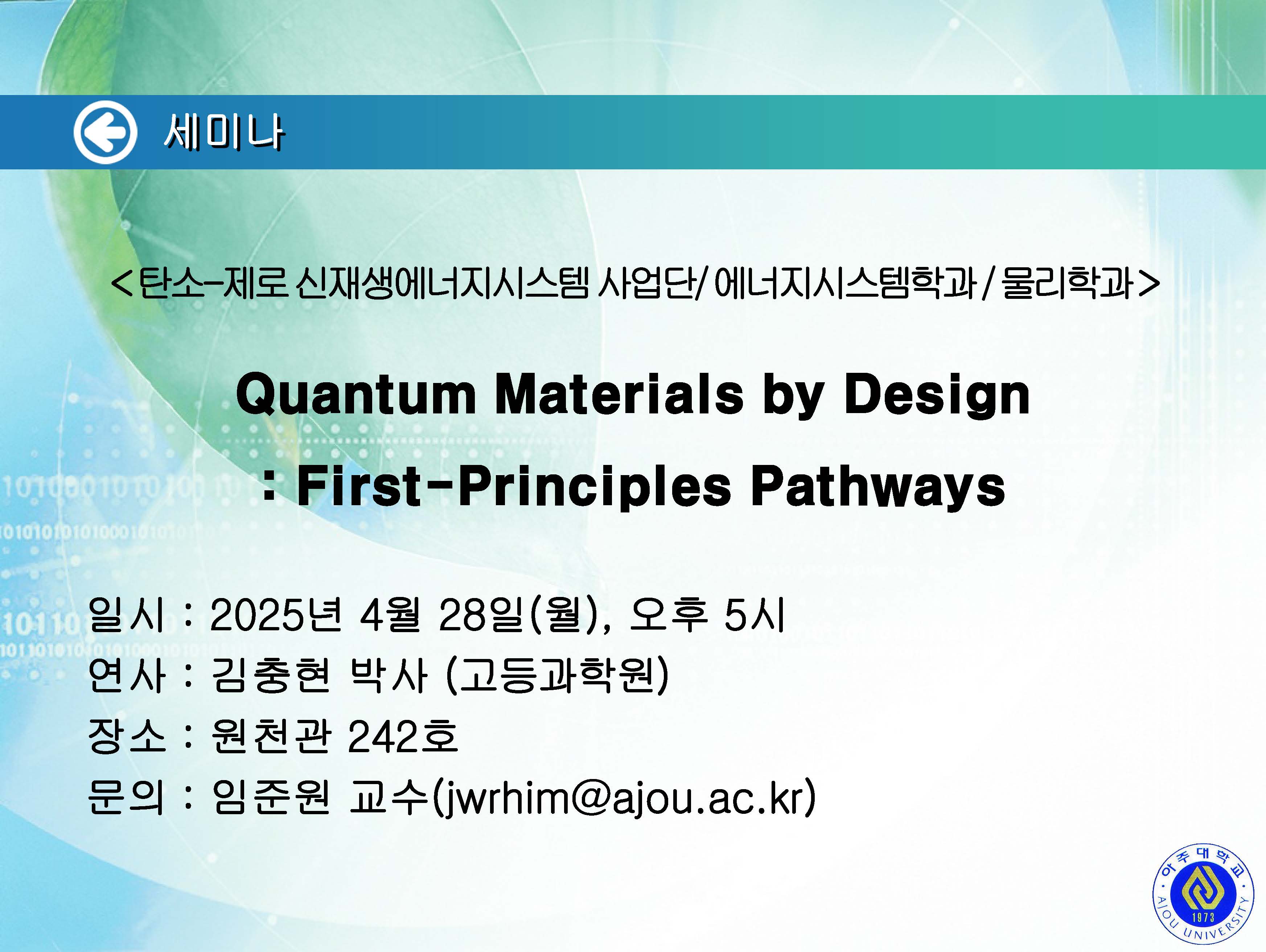 [2025.4.30(수)] < 화학과 / G-램프(LAMP)사업단 / 탄소-제로 신재생에너지시스템사업단 / 기초과학연구소 > 세미나 안내