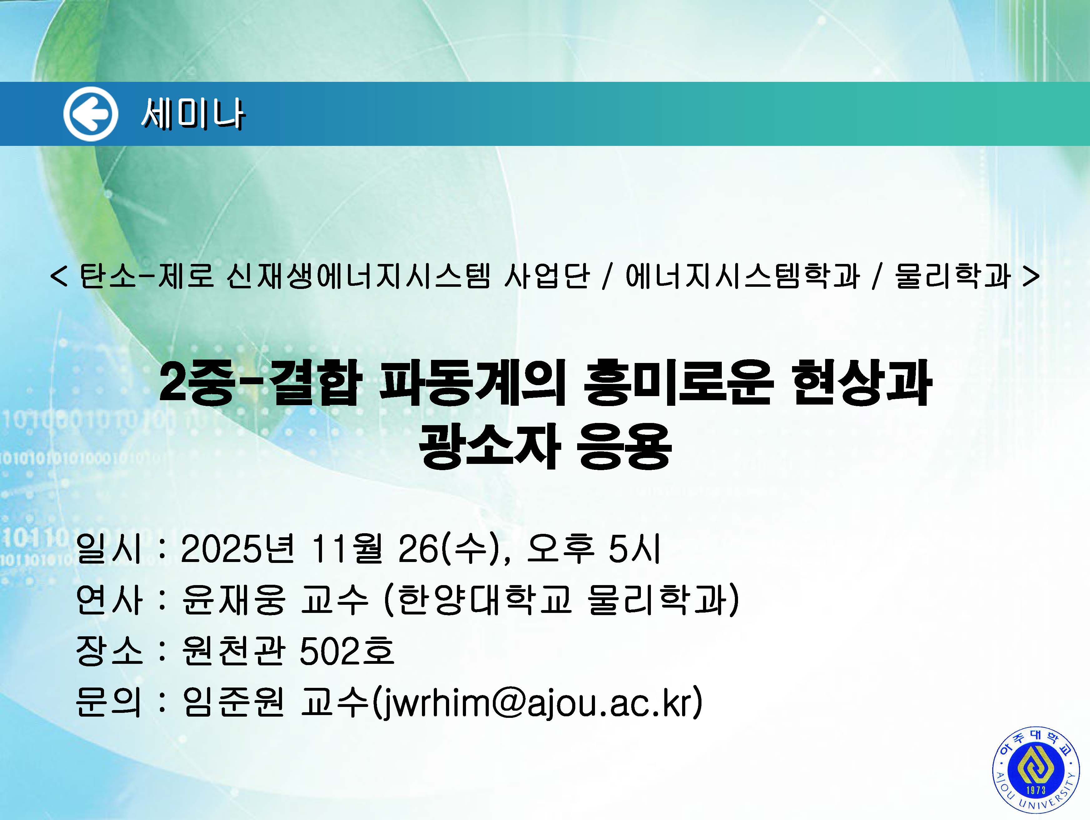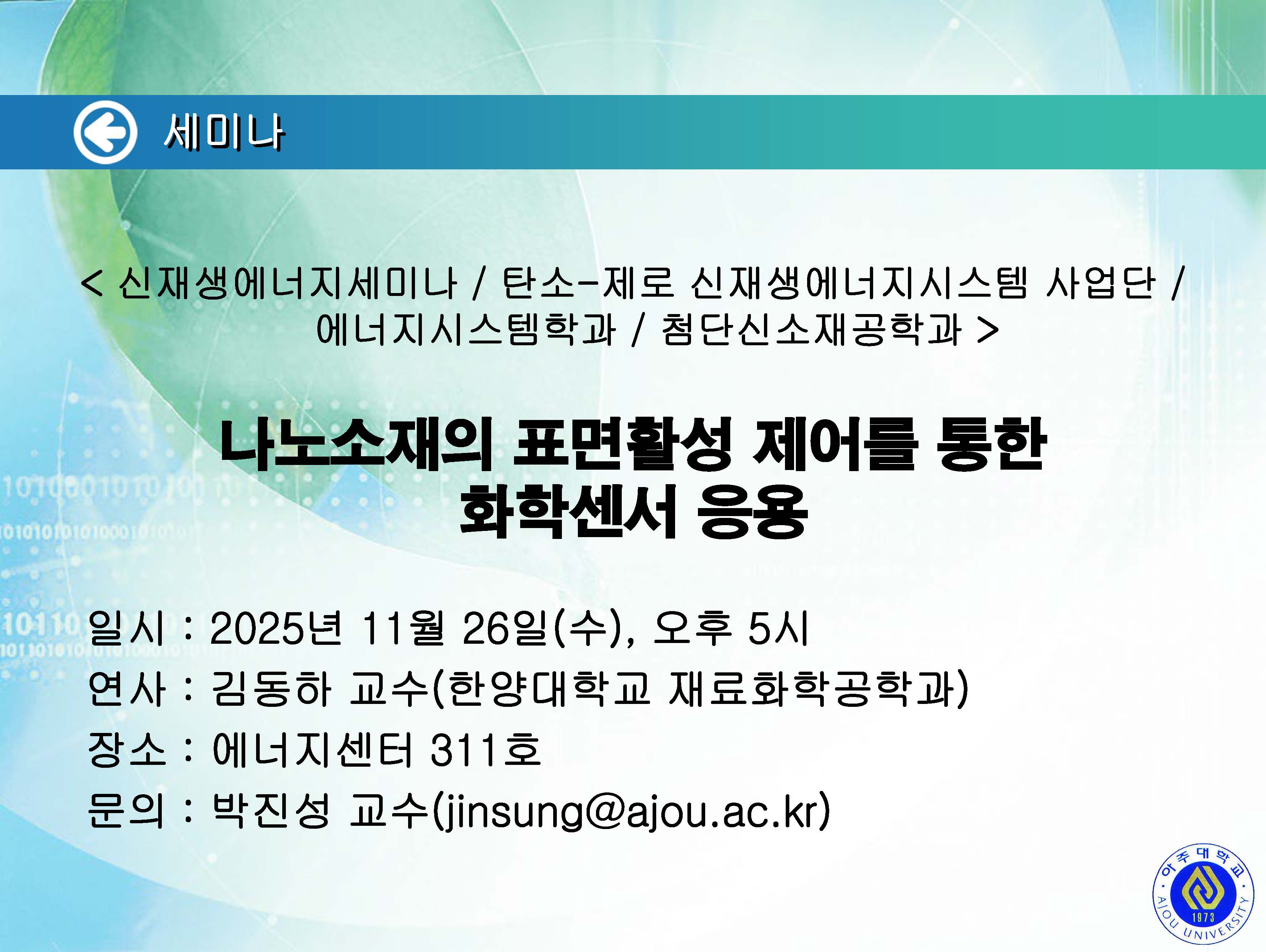 [2025.11.26.수] <신재생에너지세미나 / 탄소-제로 신재생에너지시스템 사업단 / 에너지시스템학과 / 첨단신소재공학과> 세미나 안내