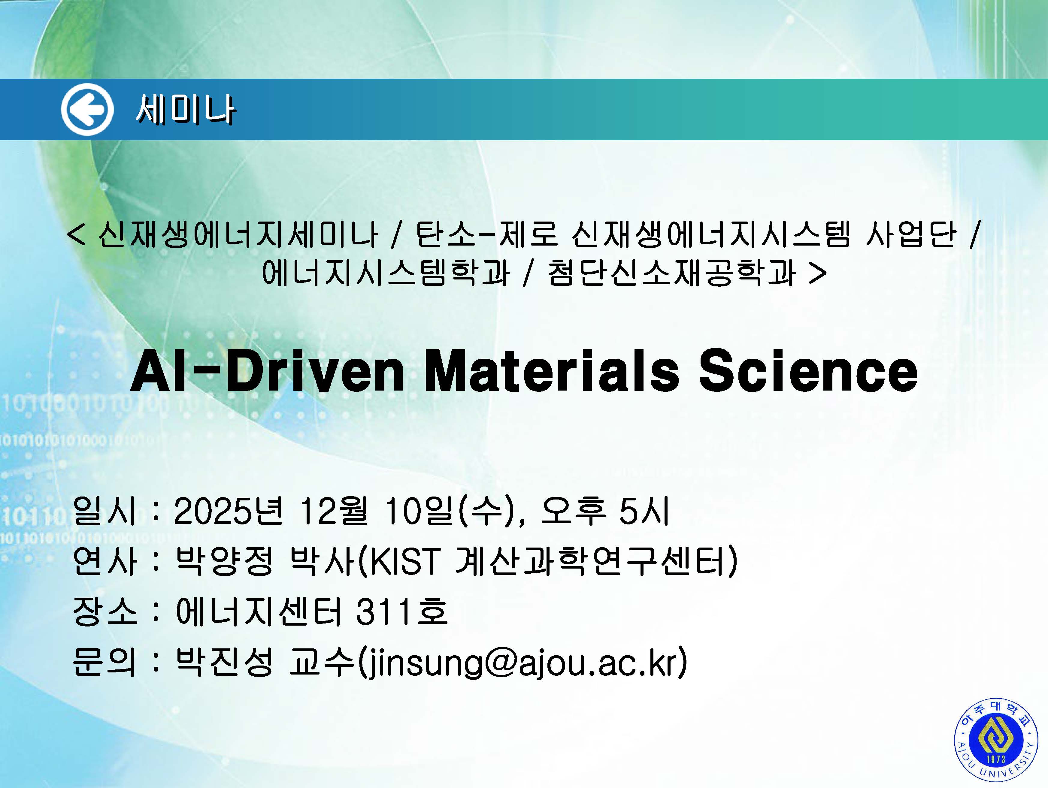 [2025.12.10.수] <신재생에너지세미나 / 탄소-제로 신재생에너지시스템 사업단 / 에너지시스템학과 / 첨단신소재공학과> 세미나 안내