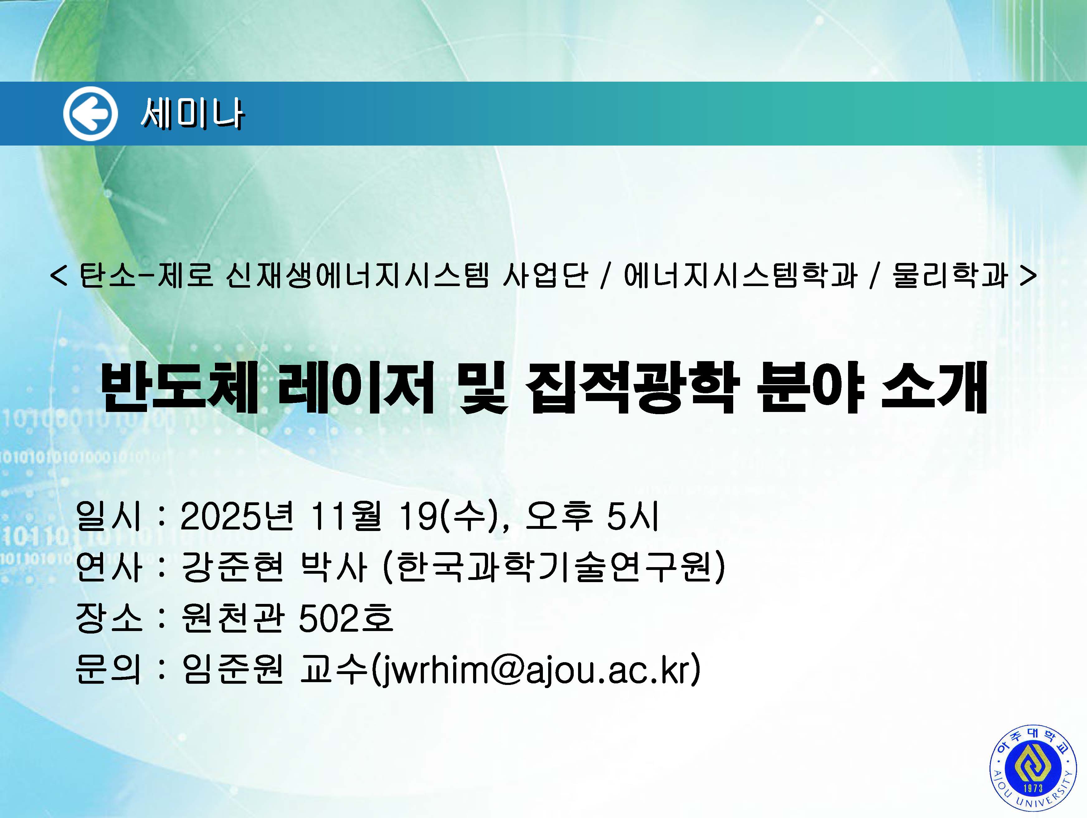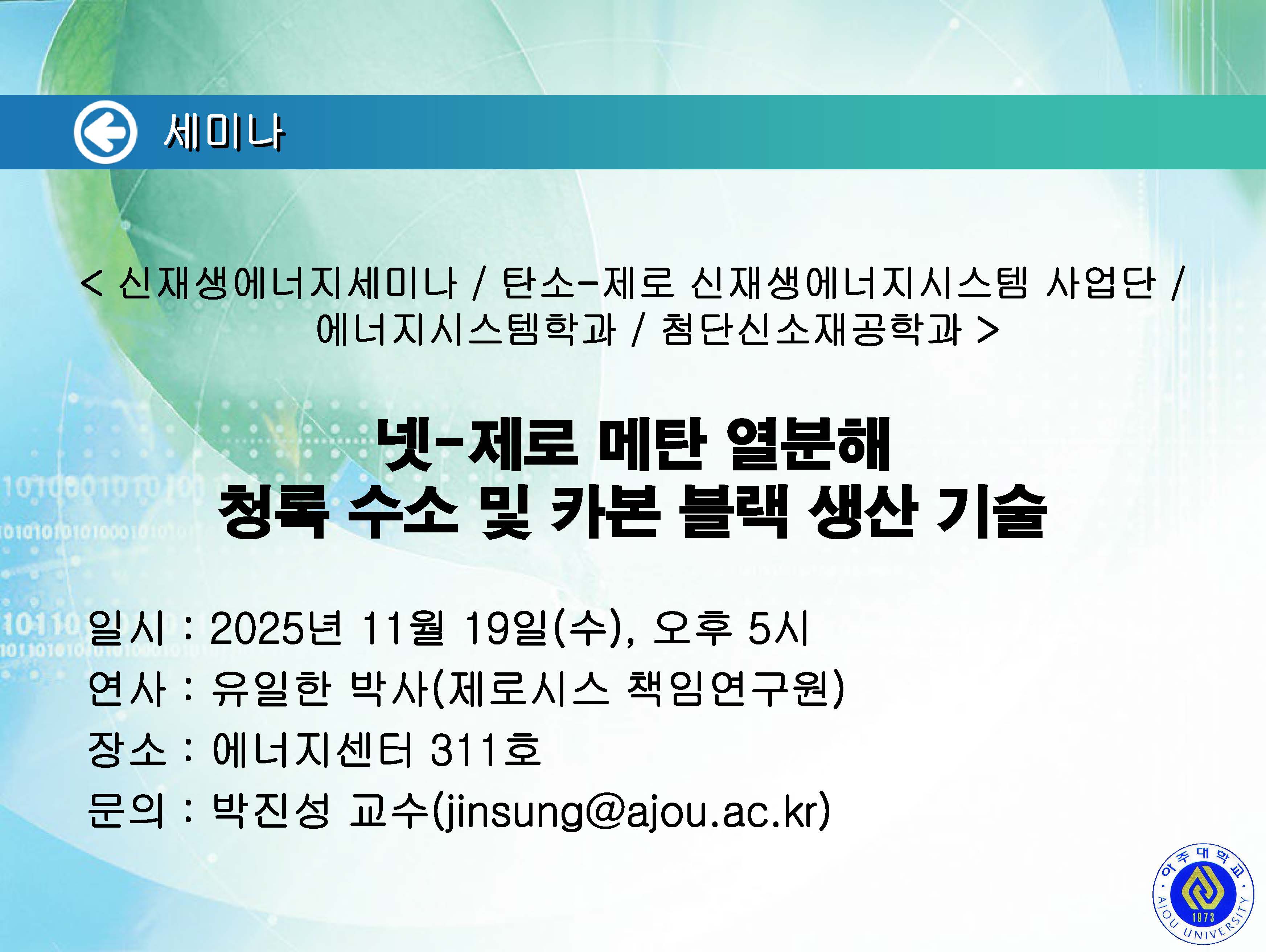 [2025.11.19.수] <신재생에너지세미나 / 탄소-제로 신재생에너지시스템 사업단 / 에너지시스템학과 / 첨단신소재공학과> 세미나 안내