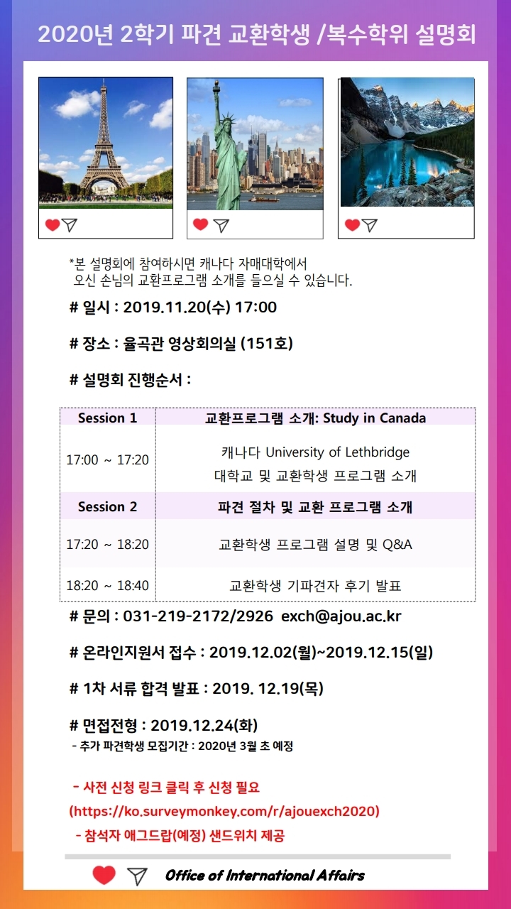 [재공지 / 일정변경] 제 23기 A.G.A. (국제학생대사, Ajou Global Ambassador) 모집 안내 (2020-1학기 활동)